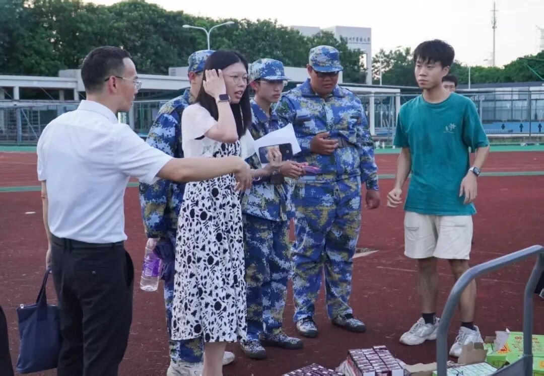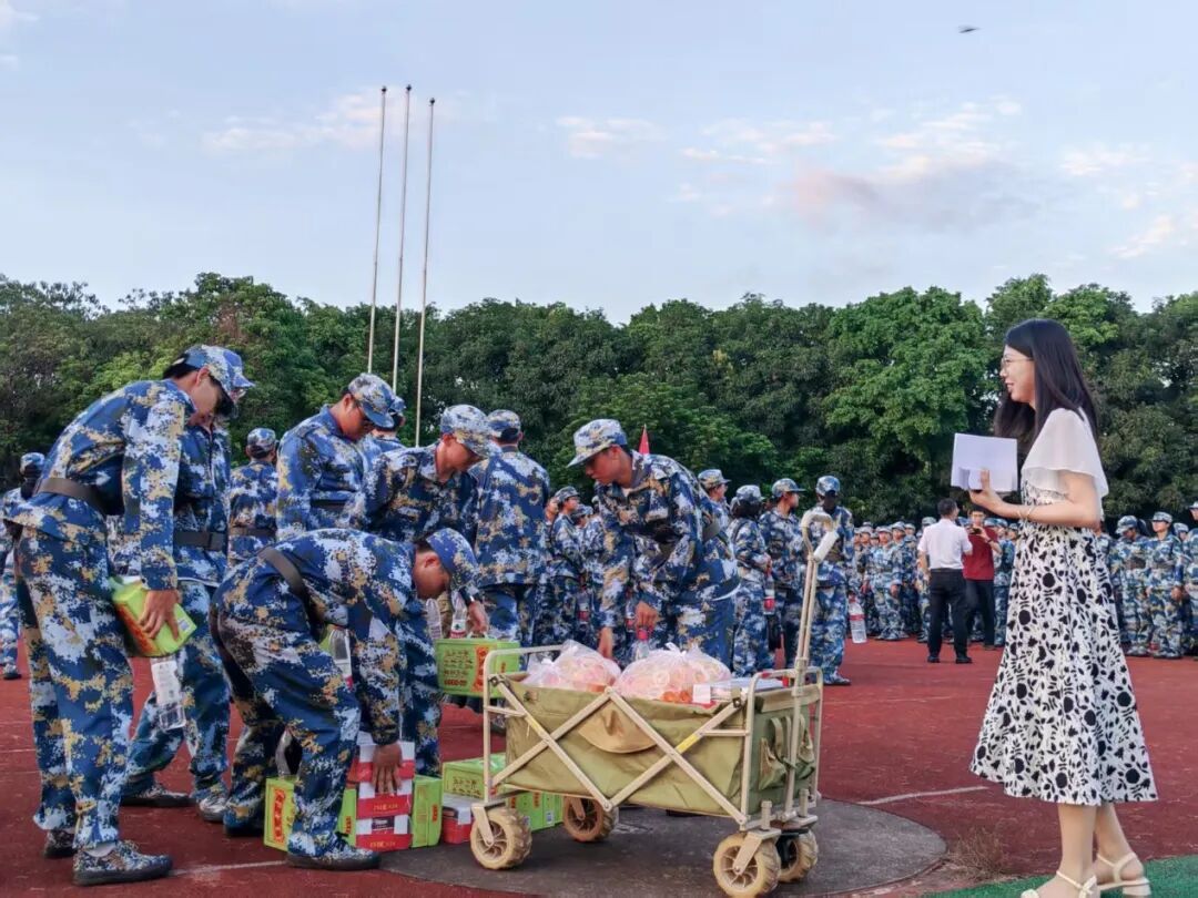 随后,慰问活动进入了温馨热烈的环节。学院领导与老师们将精心准备的慰问品逐一发放到每位新生手中。这些满载着学院关怀的饮品和食品,不仅为同学们补充了体能,更送去了沁人心脾的清凉与鼓舞。同学们有序领取,脸上洋溢着感动与喜悦的笑容。